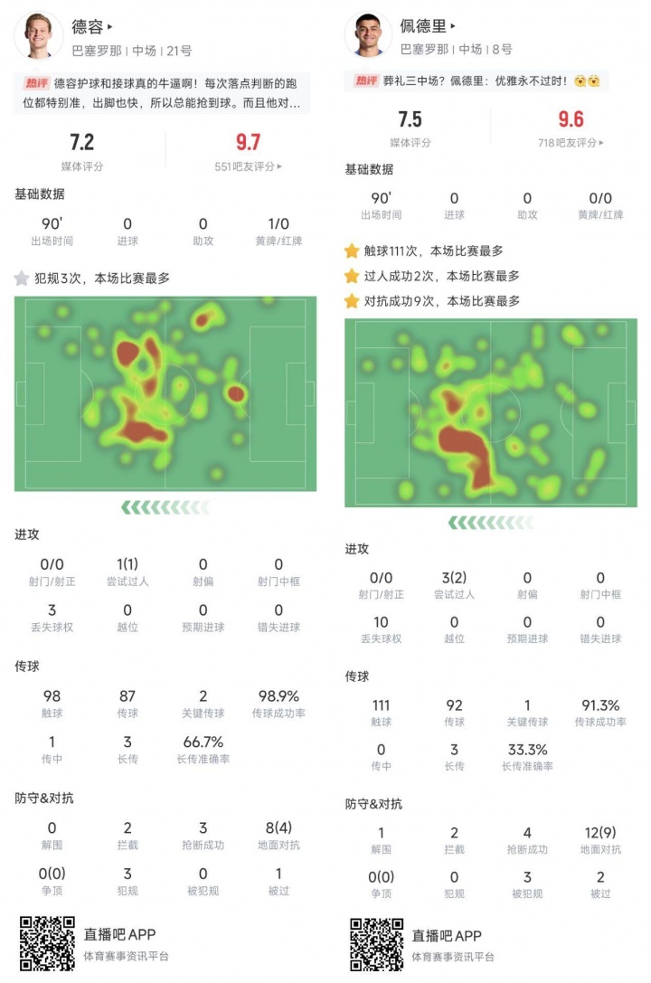 28岁的德容持球数据更离谱,98次触球87次传球,丢失球权只有3次!传球成功率98.9%!防守方面,德容也有2拦截3抢断,8次对抗4成功。
